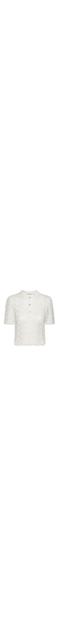 A blusa branca é confeccionada em tricot de média elasticidade. A peça solta ao corpo, possui gola portuguesa, mangas curtas, padronagem com trama aberta, leve transparência, acabamento das mangas e barra ondulado, comprimento cropped* e fechamento frontal por botões.