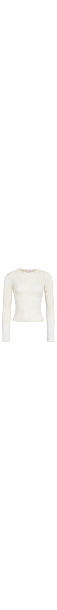 A blusa branca é confeccionada em renda. A peça solta ao corpo possui decote redondo, mangas longas, padronagem abstrata, e transparência.