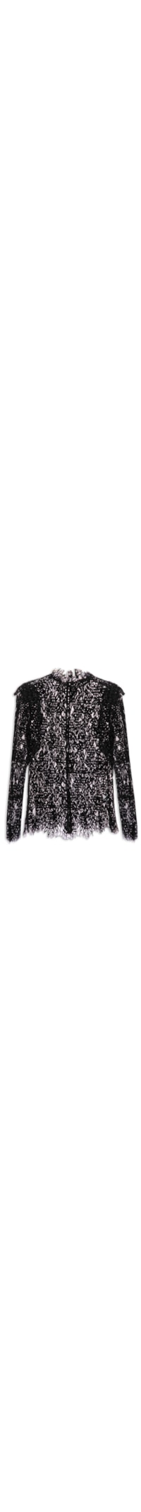 A blusa preta é confeccionada em renda sem elasticidade. A peça solta ao corpo possui gola alta, mangas longas com recorte sobreposto de babados no ombro, barra assimétrica, padronagem vazada de folhagem com recortes em veludo, sem forro e fechamento posterior em botões.