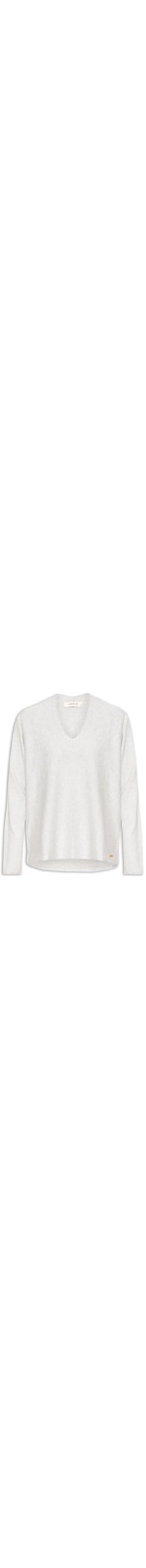 A blusa cinza é confeccionada em tricot com baixa elasticidade. A peça solta ao corpo possui decote V, mangas longas, ombros estendidos e tag da marca aplicada em metal na parte frontal da barra.