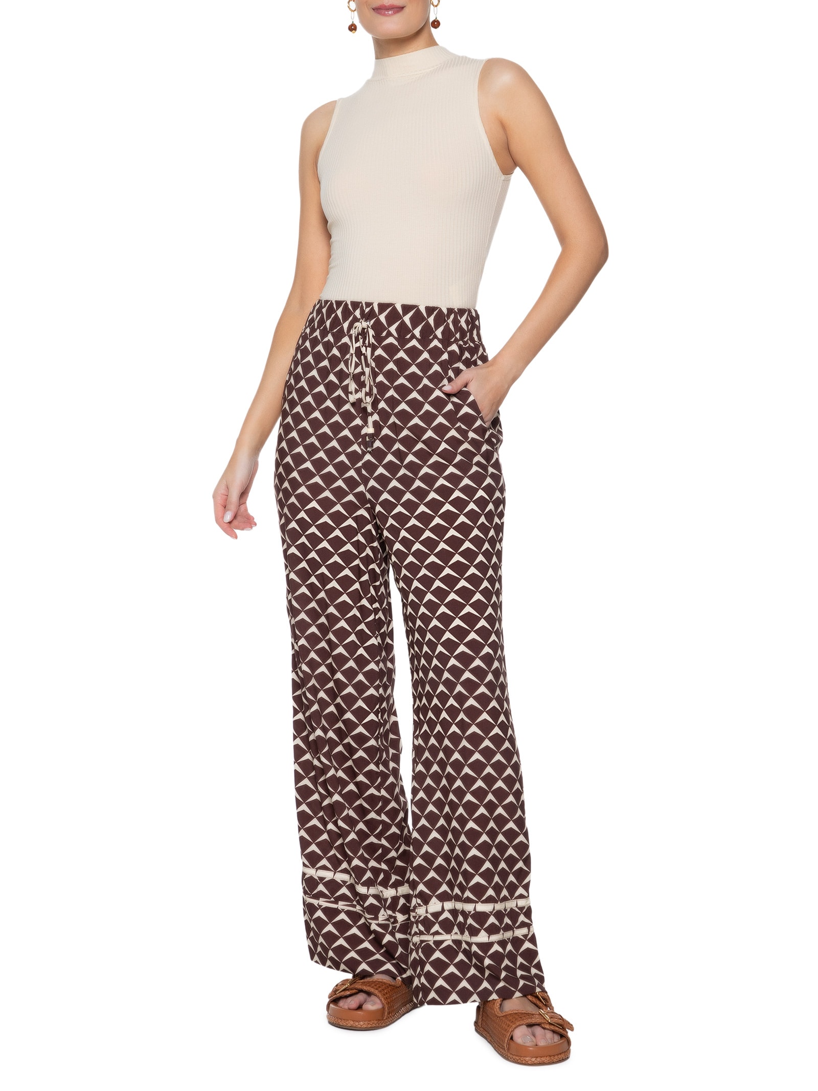 Aposte em uma produção clean e com um toque boho com esta blusa Dress To combinada com uma calça estampada, brincos detalhados e sandálias.
