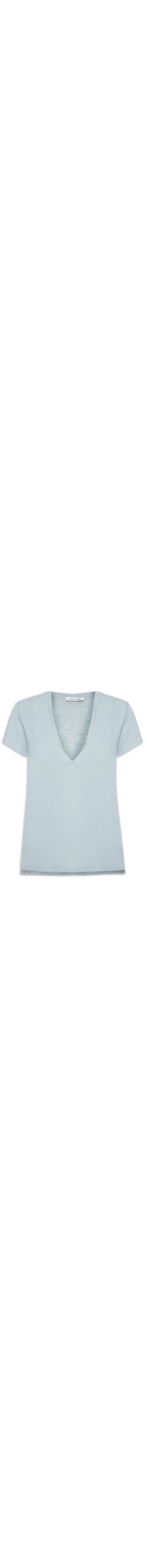 A blusa azul é confeccionada em malha leve de média elasticidade. A peça solta ao corpo, possui decote em V com acabamento canelado, combos estendidos, mangas curtas, fendas laterais, logo da marca estampado em relevo na parte posterior e comprimento longo.