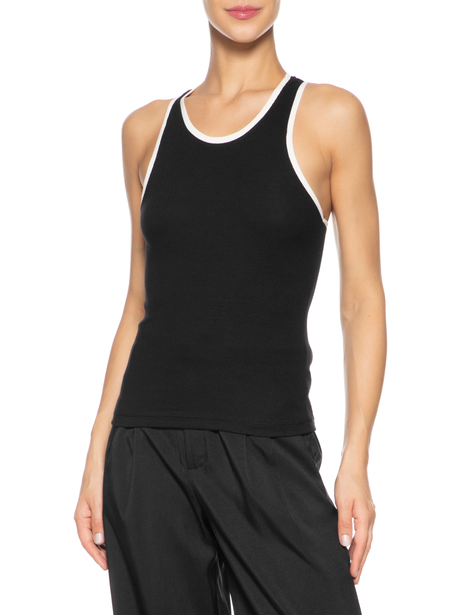 A blusa preta é confeccionada em malha canelada de algodão com alta elasticidade. A peça justa ao corpo possui decote frontal redondo e posterior nadador, alças médias, cavas estendidas e viés branco no decote e nas cavas.