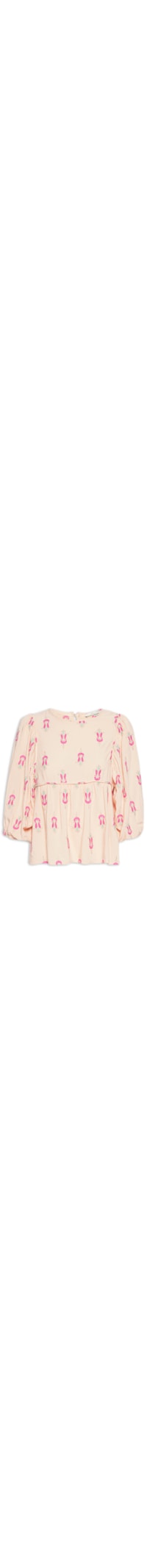 A blusa bege é confeccionada em tecido leve com toque de linho sem elasticidade. A peça solta ao corpo possui decote redondo, mangas 3/4 bufantes, recorte posterior e frontal e bordado de arabescos em cores contrastantes.