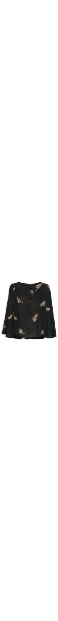 A blusa preta é confeccionada em tecido leve sem elasticidade. A peça solta ao corpo possui decote V com tira alongada de ponteira em tassel para amarração frontal, ombros com detalhe de pregas, mangas amplas de comprimento 7/8, aplicação de bordado de folhas em tom metalizado e leve transparência.
