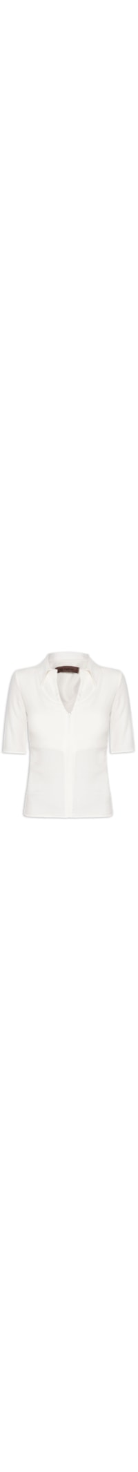 A blusa branca confeccionada em tecido leve sem elasticidade. A peça solta ao corpo possui colarinho clássico, decote V com zíper embutido, mangas curtas e logo da marca bordado na parte posterior.