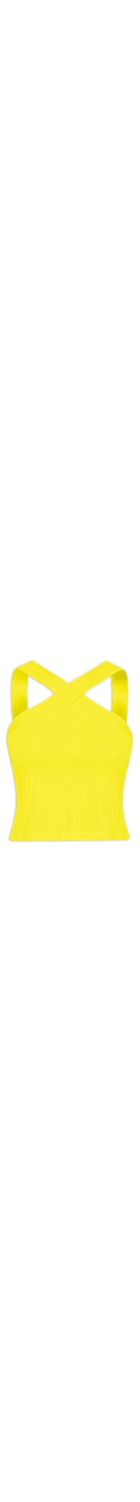A blusa amarela é confeccionada em malha canelada com alta elasticidade. A peça justa ao corpo possui decote frontal halter e posterior reto, sem bojo, alças médias cruzadas na parte frontal, cavas regulares e comprimento cropped*.