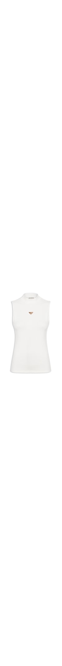 A blusa branca é confeccionada em malha leve com superfície canelada e média elasticidade. A peça justa ao corpo possui gola alta, alças largas e tag da marca metálico aplicado na parte frontal.