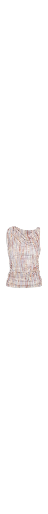 A blusa bege é confeccionada em tule com alta elasticidade. A peça solta ao corpo possui decote canoa assimétrico, alças médias com detalhes sendo uma delas com detalhe franzido com efeito drapeado e outra com acabamento torcido, estampa abstrata em cores contrastantes, forro e elástico embutido nas laterais com efeito drapeado.