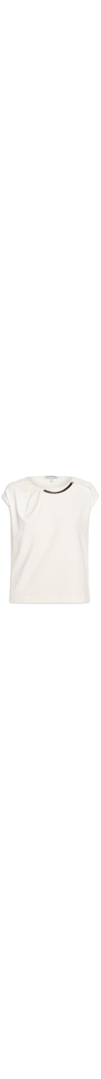 A blusa branca é confeccionada em malha leve com alta elasticidade. A peça solta ao corpo possui decote redondo, alças largas, pregas frontais com aplicação de pedrarias na cor preta e tag da marca aplicada na parte posterior.