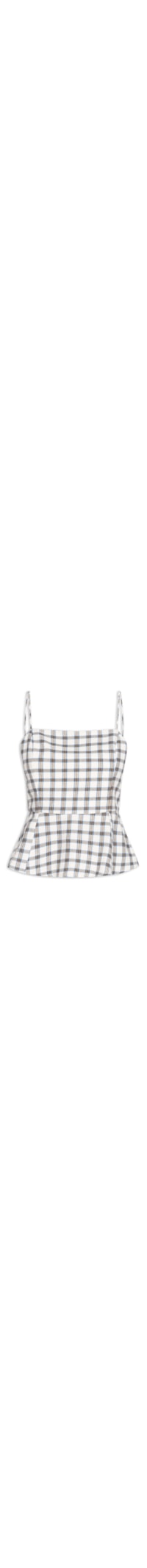 A blusa off white é confeccionada em tecido leve sem elasticidade. A peça solta ao corpo possui decote reto, alças finas ajustáveis, estampa xadrez em cores contrastantes, recorte abaixo do busto com efeito de babado, forro, acabamento pespontado e fechamento posterior por zíper.