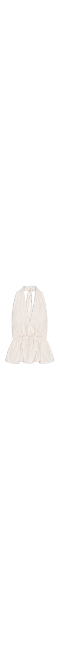 A blusa bege é confeccionado em tecido leve sem elasticidade. A peça de modelo frente única solta ao corpo possui decote V, alças pedias com regulagem por amarração na parte posterior, elástico embutido na cintura e padronagem risca de giz em cor contrastante.