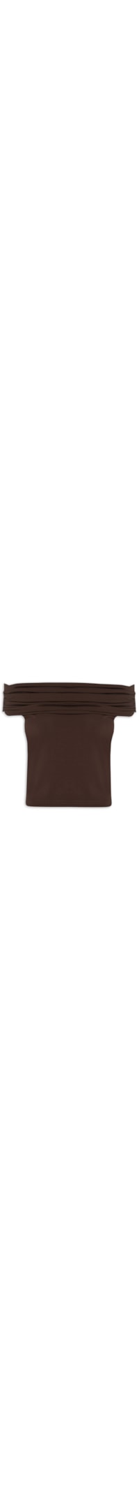 A blusa marrom é confeccionada em tecido leve com baixa elasticidade. A peça solta ao corpo possui decote ombro a ombro, cavas levemente alongadas e efeito plissado na altura do decote.