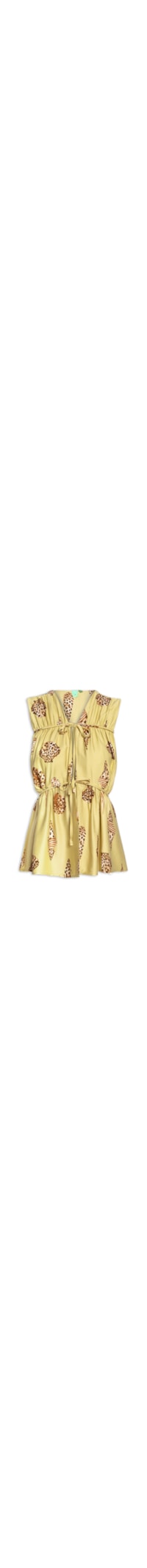 A blusa verde é confeccionada em tecido leve sem elasticidade. A peça solta ao corpo possui decote em V, alças largas, recorte frontal, cavas alongadas, elástico aplicado na parte posterior, detalhe de vivo posterior, estampa figurativa de conchas em cores contrastantes, forro e fechamento frontal por tiras alongadas aplicadas para amarração.