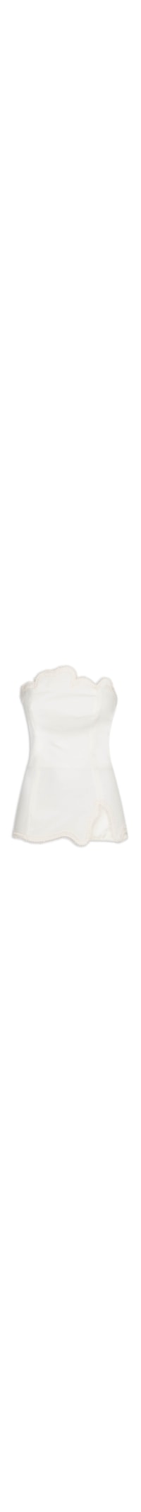 A blusa branca é confeccionada em tecido leve sem elasticidade. A peça justa ao corpo de modelo corset possui decote assimétrico, recortes frontais, detalhe em ponto caseado no decote e na barra, fenda na parte frontal, recortes na parte posterior em lastex, tag da marca metalizada aplicada na parte posterior e fechamento posterior por zíper.