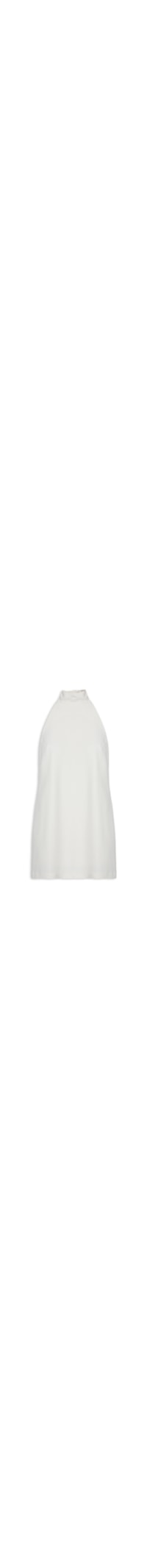 A blusa off white é confeccionada em crepe sem elasticidade. A peça de modelo frente única solta ao corpo possui decote trapézio, gola alta com faixas alongadas para amarração posterior, recorte posterior, pences frontais, forro e comprimento alongado.