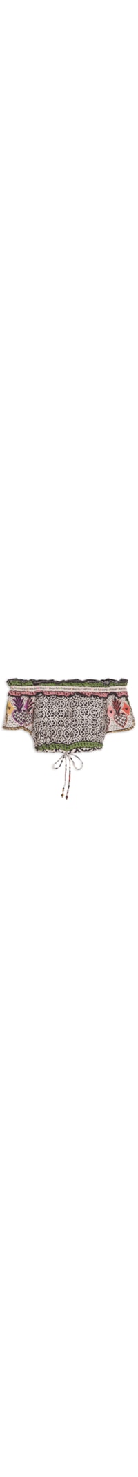 A blusa branca é confeccionada em tecido leve sem elasticidade. A peça solta ao corpo de modelo tomara que caia possui decote reto, mangas curtas, barra com tira alongada embutida para amarração frontal, mix de estampas em cores contrastantes e comprimento cropped*.