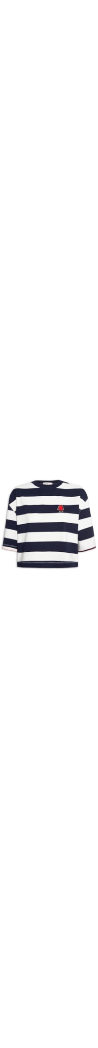A blusa branca é confeccionada em malha de algodão com média elasticidade. A peça solta ao corpo possui decote redondo com acabamento canelado, mangas curtas com detalhes de bordados na cor vermelha, ombros estendidos, padronagem listrada na cor azul, detalhe bordado na altura do busto em cores contrastantes e comprimento cropped*.