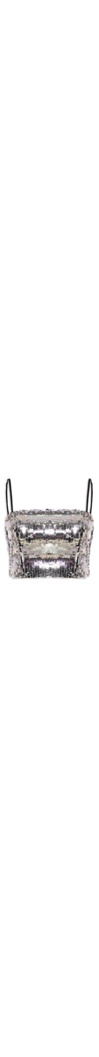 A blusa prata é confeccionada em tecido leve com superfície de paetês e sem elasticidade. A peça justa ao corpo possui decote reto, alças finas reguláveis, tag metalizada da marca aplicada na parte posterior, forro, sem bojo, comprimento cropped* e fechamento posterior em zíper.