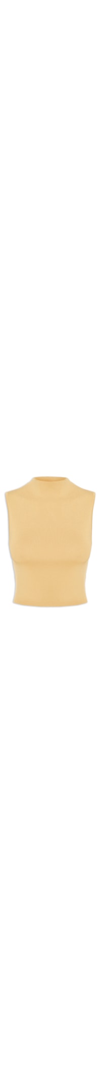 A blusa bege é confeccionada em tricot com média elasticidade. A peça justa ao corpo possui gola alta, cavas amplas sem mangas, ombros estruturados, comprimento cropped, acabamento canelado e barra reta.