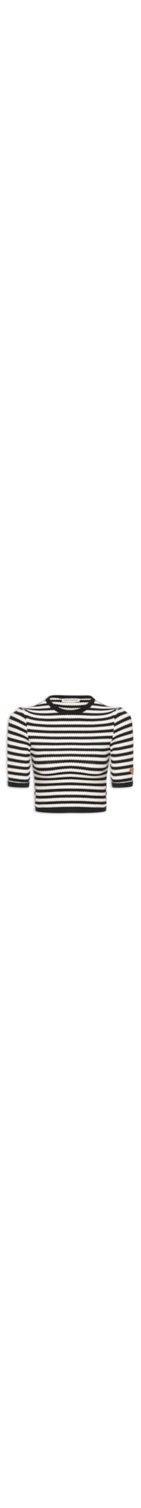A camiseta branca é confeccionada em malha leve com alta elasticidade. A peça possui gola redonda, mangas curtas, padronagem listrada em preto e branco, comprimento cropped, barra reta e acabamento canelado na gola, mangas e barra e comprimento cropped*.