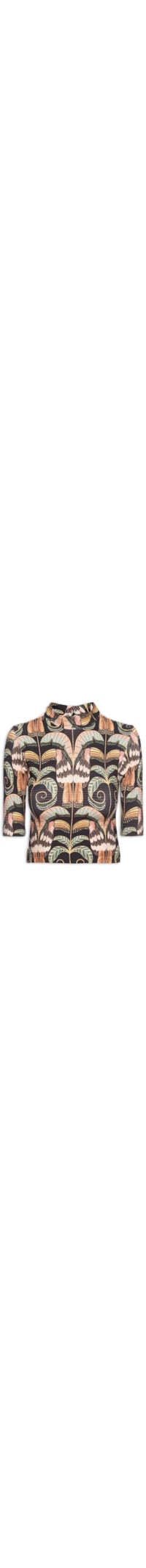 A blusa preta é confeccionada em malha de média elasticidade. A peça justa ao corpo possui gola alta, mangas curtas, mix de estampas em cores contrastantes, comprimento cropped*, superfície canelada e fechamento posterior por botão aplicado em recorte vazado.
