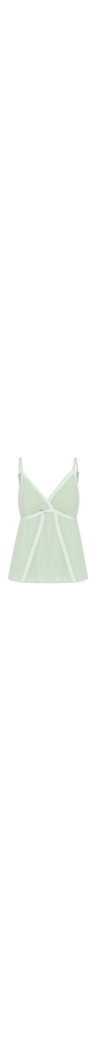 A blusa verde é confeccionada em crepe sem elasticidade. A peça solta ao corpo possui decote V transpassado, alças finas reguláveis, recortes com tira sobreposta em tom contrastante, transparência, forro e fechamento posterior por botão aplicado em recorte vazado.