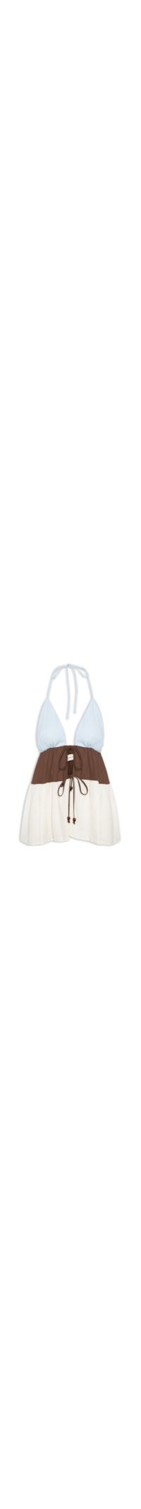 A blusa azul é confeccionada em tecido leve sem elasticidade. A peça solta ao corpo possui decote V, alças finas para amarração posterior na altura da nuca, cavas estendidas, recortes frontais vazados com tiras alongadas para amarração e decote vazado.