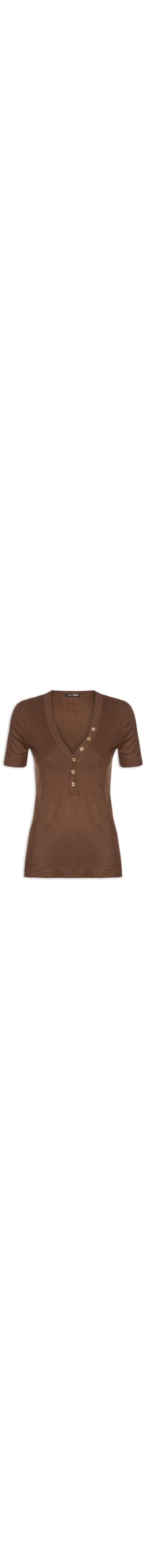 A blusa marrom é confeccionada em malha canelada com média elasticidade. A peça justa ao corpo possui decote V com botões aplicados, mangas curtas, tag da marca aplicada em metal na parte posterior e leve transparência.