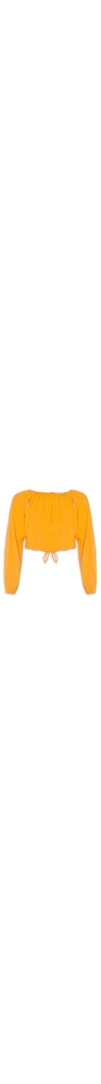 A blusa amarela é confeccionada em malha. A peça possui decote redondo com elástico embutido e detalhes de franzidos, mangas longas com elástico embutido nos punhos, recortes vazados na parte frontal e posterior, elástico embutido na barra com cordão aplicado para amarração, comprimento cropped*, shape solto, caimento reto, acabamento pespontado e fechamento posterior por botão forrado.