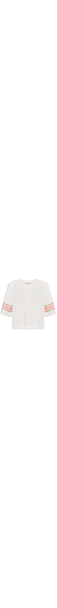 A blusa off white é confeccionada em malha com superfície texturizada. A peça possui decote redondo com acabamento canelado, mangas curtas com listras em cores contrastantes, ombros estendidos, recorte posterior, shape solto, caimento reto e acabamento pespontado.