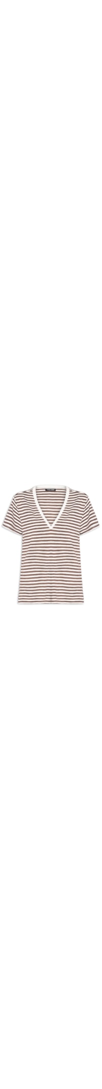 A blusa marrom é confeccionada em malha com média elasticidade. A peça solta ao corpo possui decote V com acabamento contrastante em branco, mangas curtas, ombros levemente deslocados, caimento reto, padronagem listrada horizontal em marrom e branco, pequenas fendas laterais na barra e acabamento pespontado.