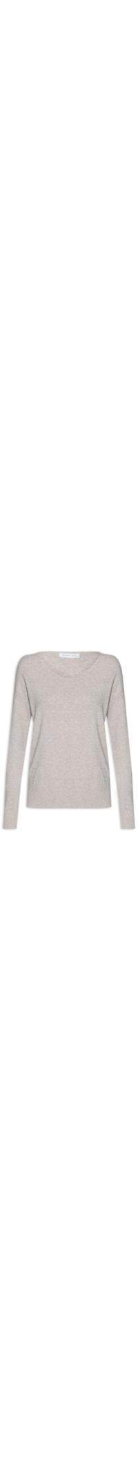 A blusa bege é confeccionada em tricot com alta elasticidade. A peça solta ao corpo possui decote em V, mangas longas com ajuste nos punhos, detalhe frontal de nervura, recorte frontal e barra mullet*.