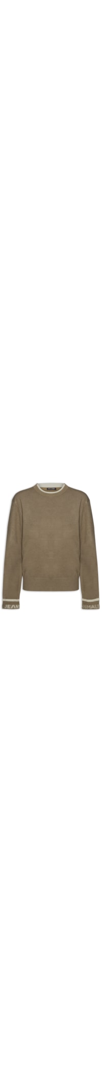 A blusa marrom é confeccionada em tricot com média elasticidade. A peça solta ao corpo possui gola redonda com acabamento canelado em cor contrastante, mangas longas com punhos dobrados e detalhe em jacquard com o nome da marca e ombros levemente deslocados.