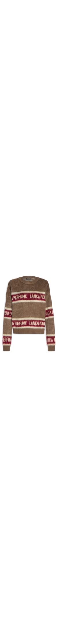 O suéter marrom é confeccionado em tricot com superfície em pelos e baixa elasticidade. A peça solta ao corpo possui decote arredondado com acabamento canelado, mangas longas com punhos ajustados, ombros levemente deslocados, tag da marca aplicada na parte posterior e estampa figurativa em cores contrastantes aplicada na parte frontal e posterior.