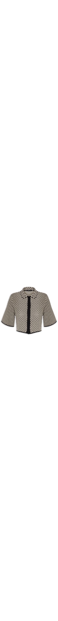 A blusa preta é confeccionada em tricot. A peça possui colarinho simples com acabamento canelado, mangas curtas amplas, padronagem xadrez em cor contrastante, comprimento cropped**, barra levemente arredondada, shape solto e fechamento frontal por botões de pressão.