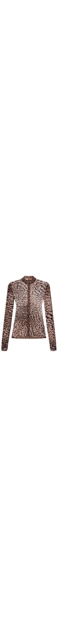 A blusa preta é confeccionada em tule com superfície devorê de média elasticidade. A peça justa ao corpo possui gola alta, mangas longas, recorte assimétrico com franzido na parte frontal e posterior, padronagem animal print, transparência, sem forro e fechamento posterior por zíper invisível.