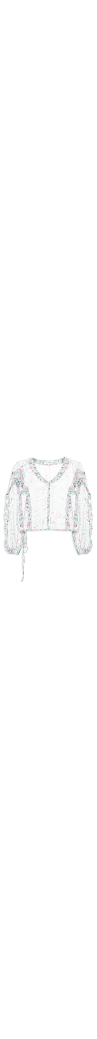 A blusa rosa é confeccionada em tecido leve sem elasticidade. A peça solta ao corpo possui decote V, mangas longas bufantes, recortes com efeito de babado nas partes frontal e posterior, tira fina embutida na barra para ajuste lateral, transparência, estampa abstrata em cores contrastantes e fechamento frontal por botões.