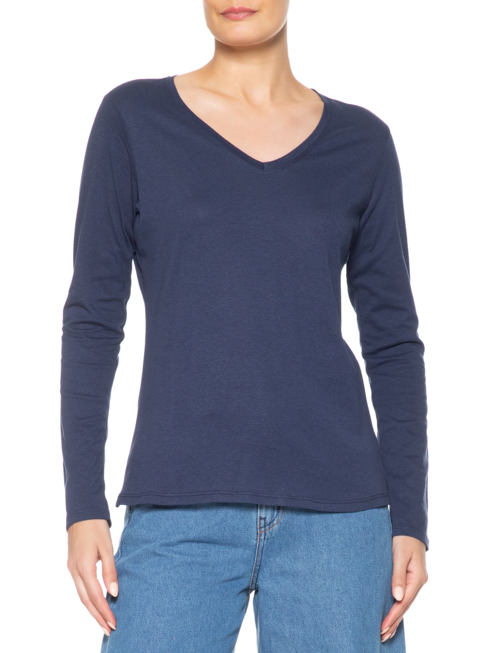 A blusa azul é confeccionada em malha de algodão com média elasticidade. A peça solta ao corpo possui decote V e mangas longas.
