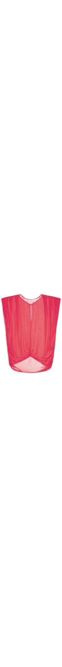 A blusa rosa é confeccionada em crepe. A peça possui decote redondo, alças largas com detalhe de pregas, ombros estendidos, cavas regulares, transparência, recorte posterior vazado com botão aplicado, barra mullet* arredondada na parte frontal, detalhe de franzido nas partes laterais e detalhe de nó na parte posterior na altura da barra e shape solto.