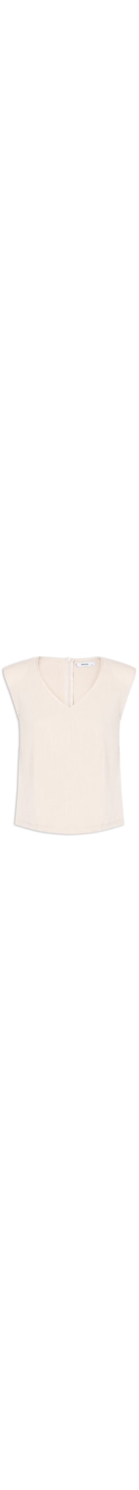 A blusa bege é confeccionada em tecido leve sem elasticidade. A peça solta ao corpo possui decote V, cavas regulares, alças médias e recorte posterior.