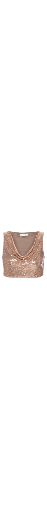 A blusa dourada é confeccionada em tecido leve com superfície em paetê com baixa elasticidade. A peça justa ao corpo possui decote degagê, alças médias, cavas regulares, forro e comprimento cropped*.