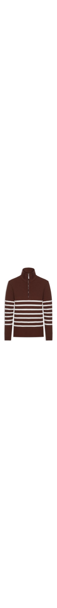 A blusa marrom é confeccionada em tricot com alta elasticidade. A peça solta ao corpo possui gola alta, mangas longas, padronagem de listras na cor branca, fendas laterais e abertura frontal com fechamento por zíper.
