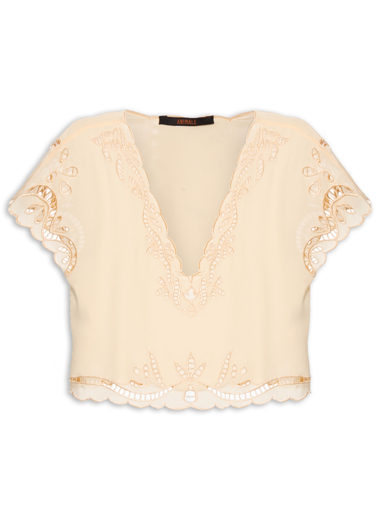 A blusa bege é confeccionada em seda sem elasticidade. A peça solta ao corpo possui decote V com bordado richilieu, transparência, mangas japonesa e barra com bordado richilieu aplicado.