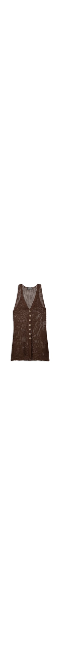 A blusa marrom é confeccionada em tricot com alta elasticidade. A peça justa ao corpo possui decote V, alças médias, fendas laterais, tag da marca metalizada aplicada na parte posterior e fechamento frontal por botões.