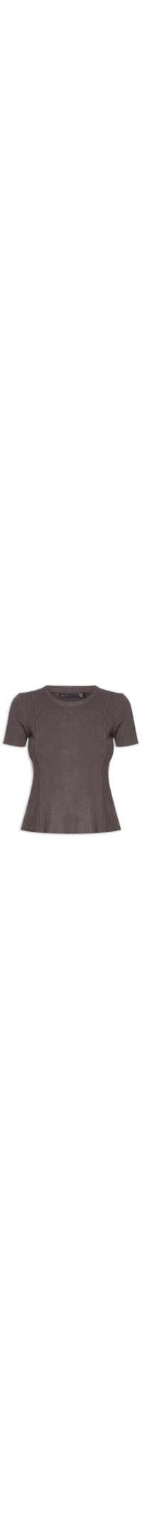 A blusa cinza é confeccionada em tricot com superfície canelada de média elasticidade. A peça justa ao corpo, possui decote redondo, mangas curtas e detalhes de nervura na parte frontal.