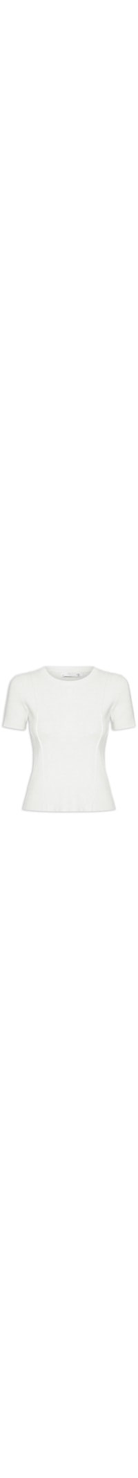 A blusa off white é confeccionada em tricot com superfície canelada de média elasticidade. A peça justa ao corpo, possui decote redondo, mangas curtas e detalhes de nervura na parte frontal.