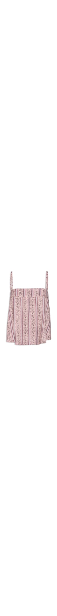 A blusa roxa é confeccionada em tecido leve com toque de linho sem elasticidade. A peça solta ao corpo possui decote reto, alças finas com regulagem, elástico embutido na parte posterior na altura do decote, recorte frontal com vivo, mix de estampas em cores contrastantes e barra arredondada.
