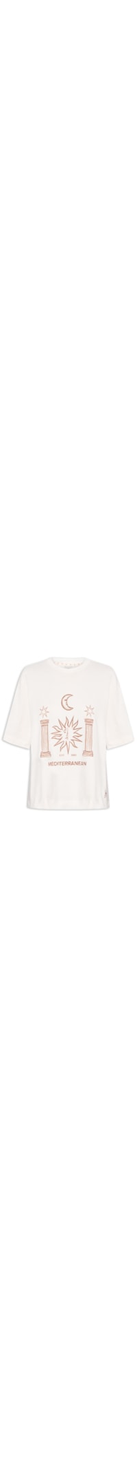 A blusa bege é confeccionada em malha de algodão com média elasticidade. A peça solta ao corpo possui decote redondo com acabamento canelado, mangas curtas, ombros estendidos, estampa frontal em silk com cor contrastante, tag da marca bordada na parte frontal e fendas laterais.
