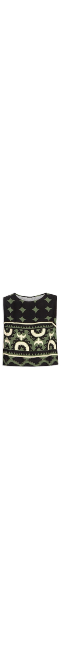 A blusa preta é confeccionada em tecido leve sem elasticidade. A peça solta ao corpo possui decote arredondado, alças largas, cavas regulares, padronagem geométrica em cores contrastantes e comprimento cropped*.
